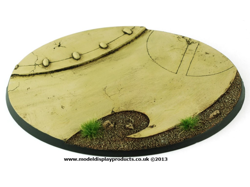 These bases come unpainted and without static grass or other additions, they can be drilled and sanded. Shown painted and flocked for photographic/display purposes only.