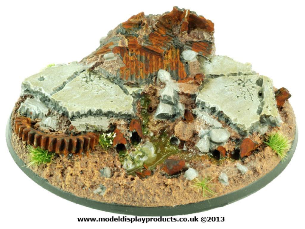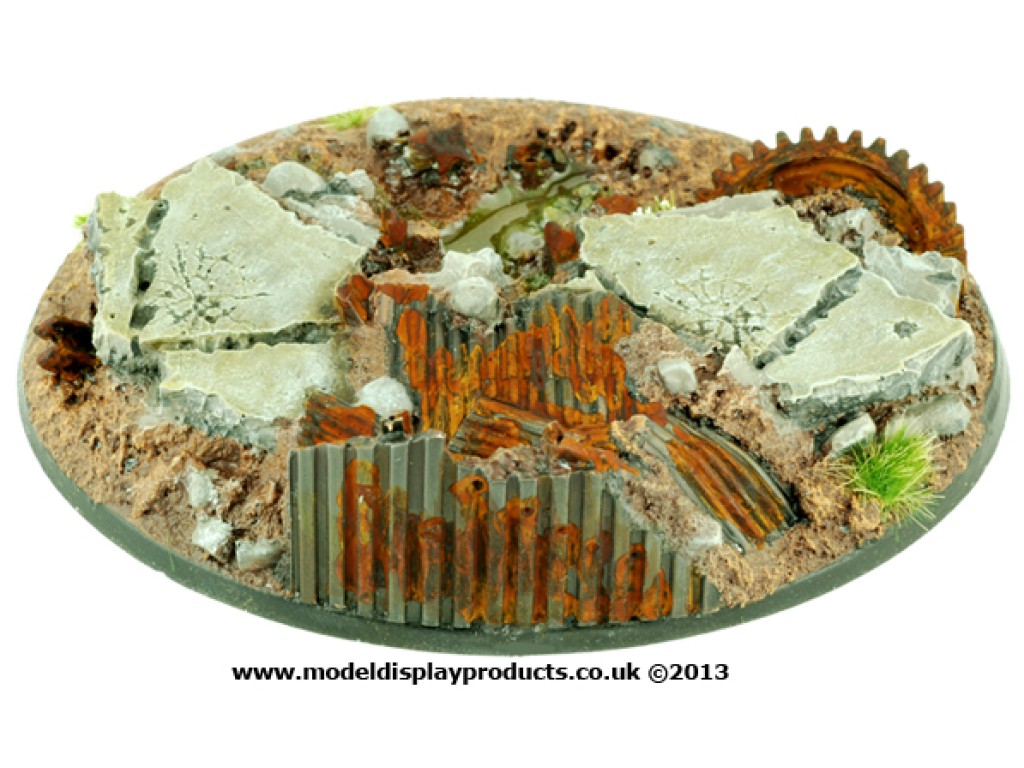 A single 120mm Oval Sci-fi style base with an Industrial Rubble theme for popular skirmish/war games on the market.