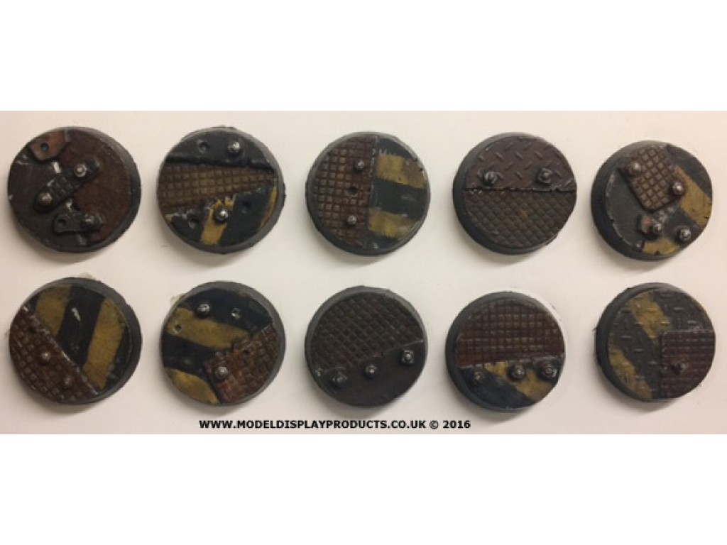 A set of 10, 25mm round Sci-fi bases with a tech/ Star ship deck theme for popular skirmish/war game..