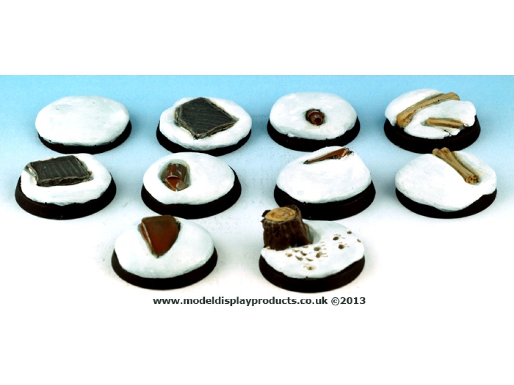A set of 10, 25mm round Sci-fi bases with a Snow terrain theme for popular skirmish/war games on the market. These bases come unpainted and without static grass or other additions, they can be drilled and sanded.