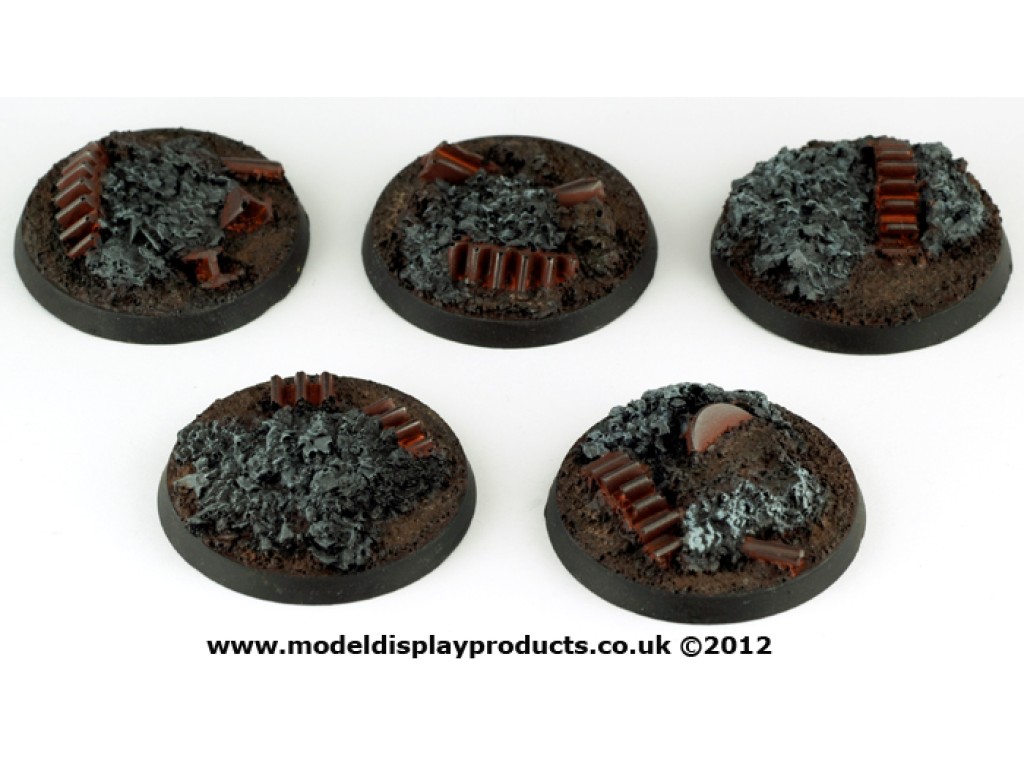 A set of 5, 40mm round Sci-fi bases with an industrial rubble theme for popular skirmish/war games on the market.