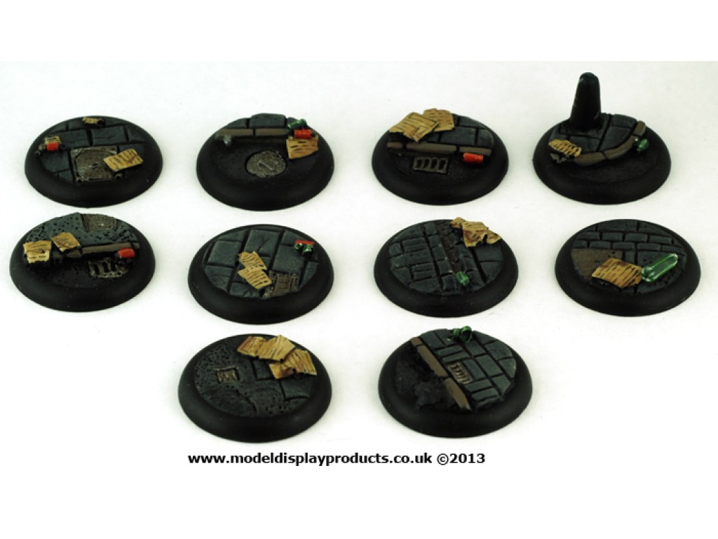 50mm round lip gaming bases for popular skirmish/war games on the market with a Gothic Street theme,..